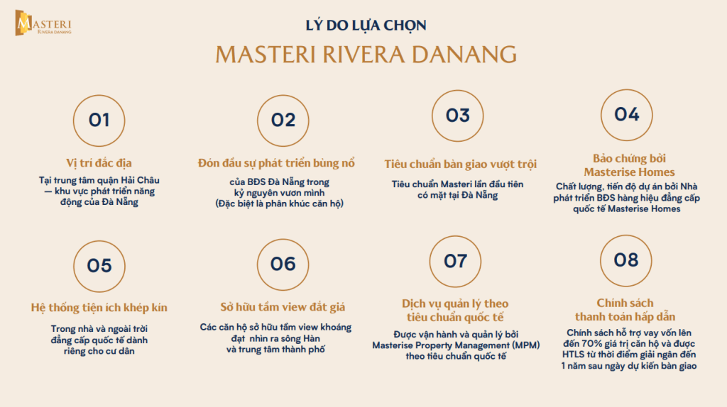 Giá trị tăng trưởng: Vị trí ven sông, thương hiệu Masterise, và sự phát triển mạnh mẽ của Đà Nẵng đảm bảo giá trị bất động sản tăng bền vững.